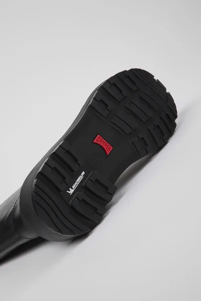 Black leather women’s boots with EVA midsoles, OrthoLite® Recycled™ footbeds, and Michelin rubber outsoles (27% natural).