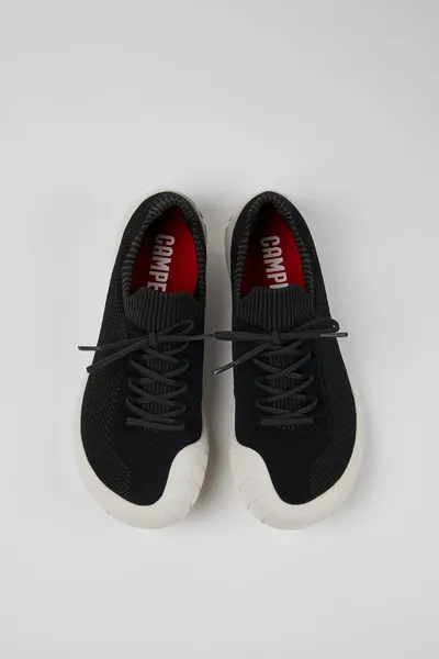 Black men’s sneakers with recycled polyester & elastane one-piece knit, lace closures, recycled OrthoLite® footbeds, and rubber outsoles.