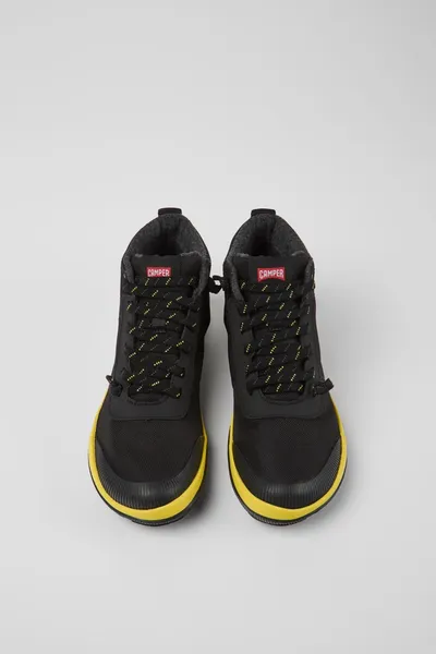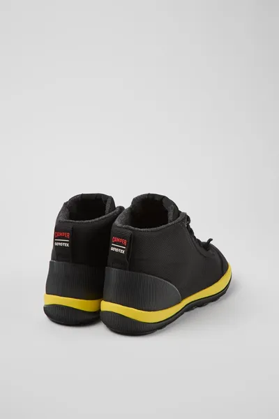 Black recycled PET women’s ankle boots with GORE-TEX technology, OrthoLite® Recycled™ footbeds and 27% natural rubber Michelin outsoles.
