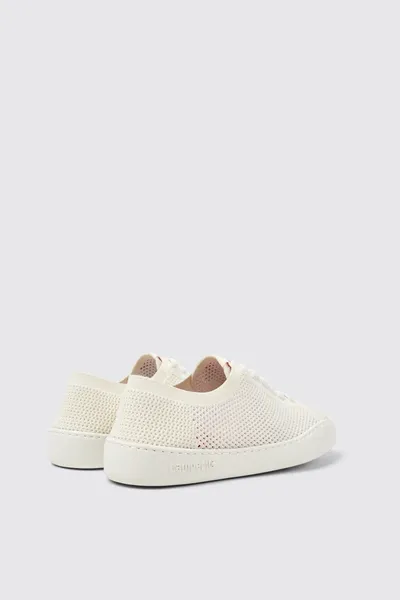 White recycled PET women’s sneakers with OrthoLite® Recycled™ footbeds, elastic laces, and recycled EVA outsoles (20% recycled).