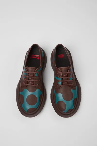 Burgundy and blue leather women’s shoes with graphic circular motif, OrthoLite® Recycled™ removable footbeds, and rubber outsoles.