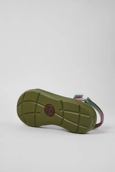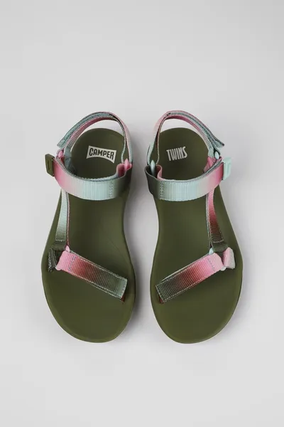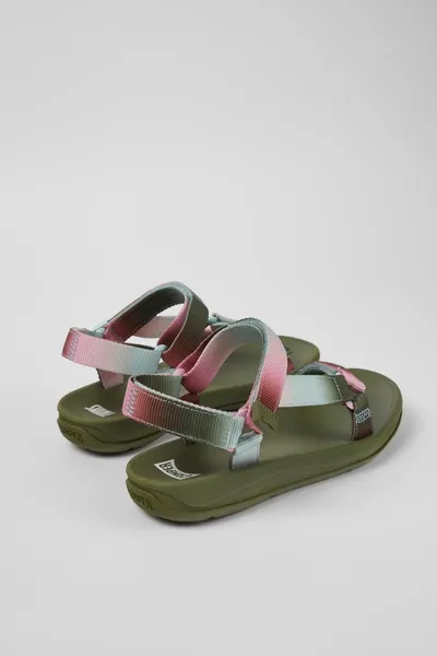 Multicolored textile women’s sandals with hook-and-loop closures, recycled polyester webbings, and EVA & rubber outsoles.